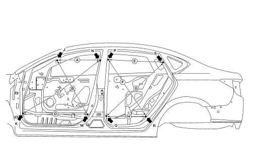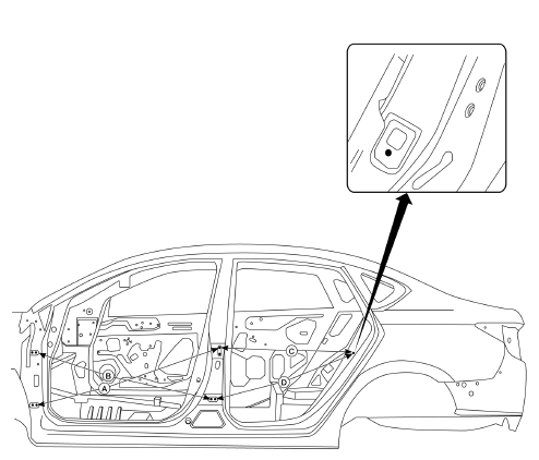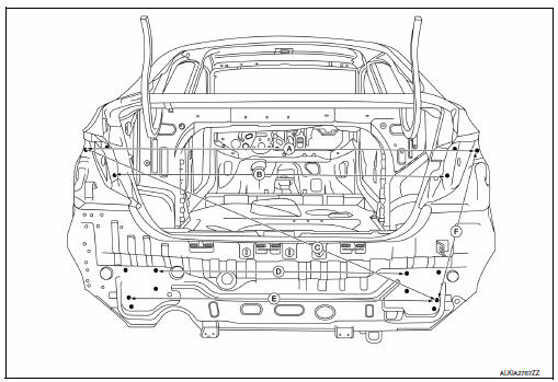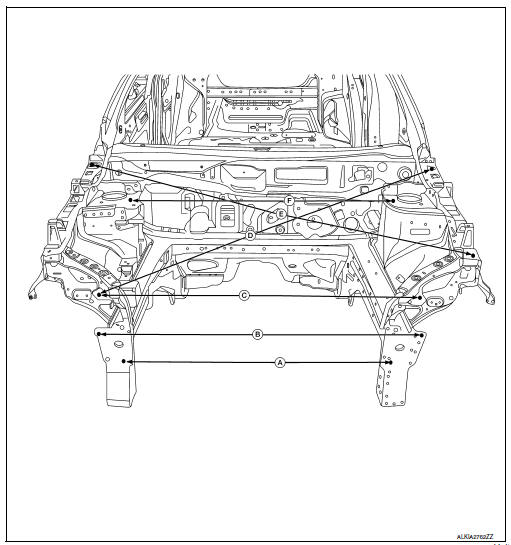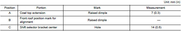 A mark has been placed on each part of the body to indicate the vehicle center. When repairing parts damaged by an accident which might affect the vehicle frame (members, pillars, etc.), more accurate and effective repair will be possible by using these marks together with body alignment specifications.
