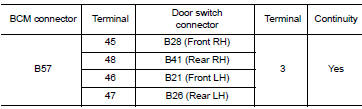 Check door switches DOOR SW-DR, DOOR SW-AS, DOOR SW-RL, DOOR SW-RR in Data Monitor mode with CONSULT.