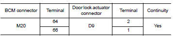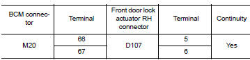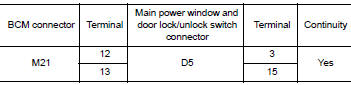 Check continuity between power window and door lock/unlock switch rh terminals.