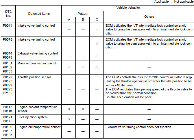 | Detected items | Engine operating condition in fail-safe mode | Remarks | Reference page |