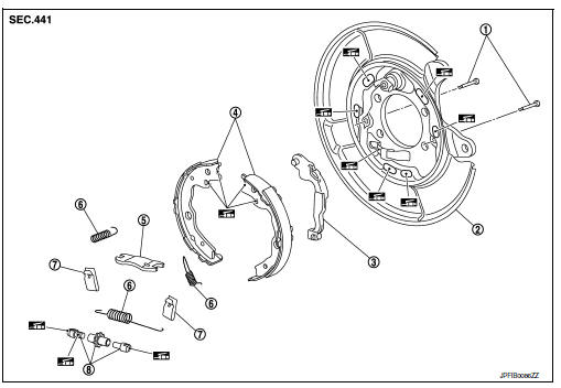 Wear limit thickness : Refer to PB-13, "Parking Drum Brake".