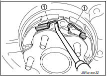 Remove the return spring (1) from the lower side of the parking brake shoes.