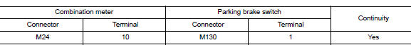 Check continuity between combination meter connector M24 terminal 10 and parking brake switch connector M130 terminal 1.