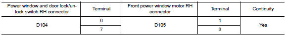 Check front power window motor RH operation with main power window and door lock/unlock switch or power window and door lock/unlock switch.