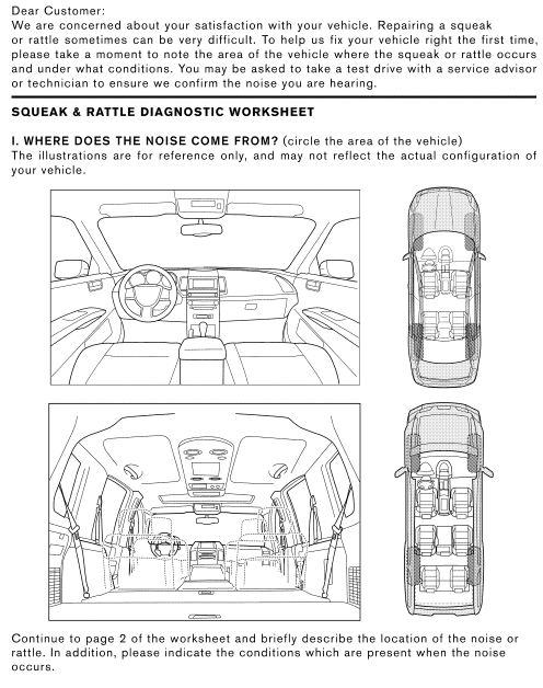 Interview the customer if possible, to determine the conditions that exist when the noise occurs. Use the Diagnostic Worksheet during the interview to document the facts and conditions when the noise occurs and any customer's comments; refer to GW-9, "Diagnostic Worksheet". This information is necessary to duplicate the conditions that exist when the noise occurs.