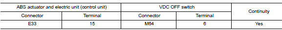 Check continuity between ABS actuator and electric unit (control unit) connector E33 terminal 15 and VDC OFF switch connector M64 terminal 6.